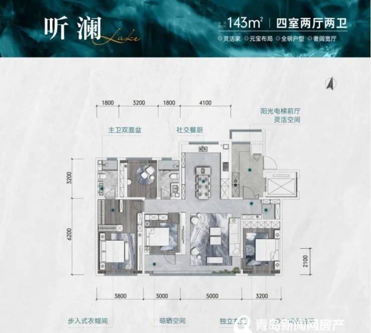 东李的新房市场现在普遍以建面约140㎡以上的低密产品为主,来自于市南、市北浮山后的改善置业者占到了一定的比例,大部分改善家庭的常住人口结构发生变化,而这个时候需要的户型不仅仅是单纯的面积大、空间多,而是可变性。青特滨湖国际二期的“灵活家”的设计概念,可以实现从两口之家到小朋友分巢、三代同堂再到重新回到老年生活的二人世界每一个阶段的居住需求。