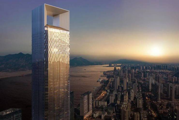 如果用空中视角来审视这座389米的地标,建成之后,其最高处的塔冠是俯瞰整座温州城的“瓯江之眼”。塔身好似灯塔,“编织”设计的幕墙肌理在阳光照射下,如同波光粼粼的瓯江。再往下,则是“瓯江之门“,长达122米的悬浮玻璃盒子。