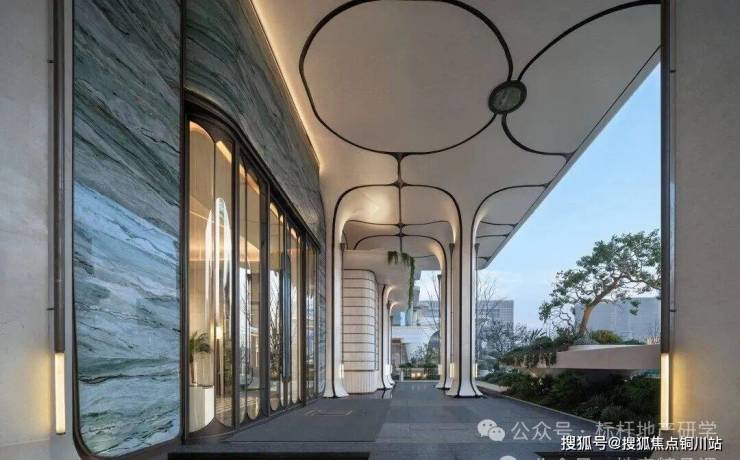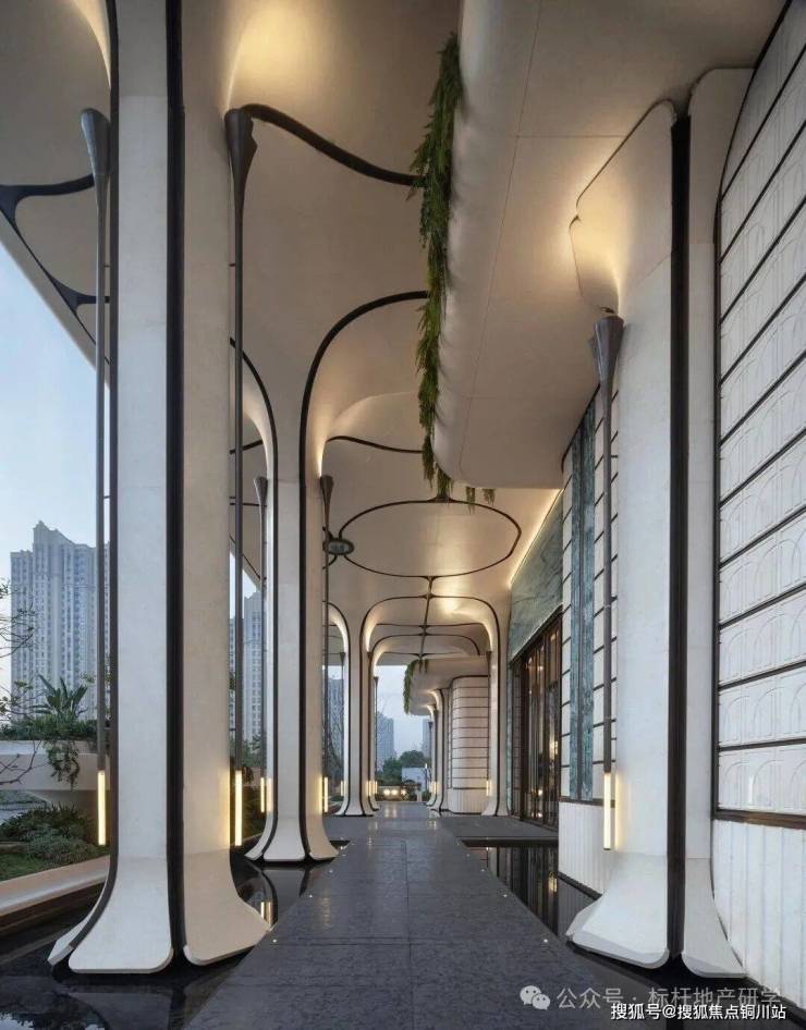 大门界面,以原创的“马蹄莲”艺术廊架作为独特的社区形象符号,弧线造型消解柱体的生硬感,打造一座与连廊灰空间、架空层共享空间相融的垂直绿洲。