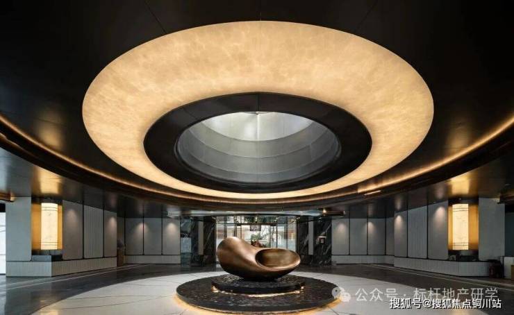 入口大堂以轻盈通透的玻璃立面,让建筑如同漂浮在水面的玻璃盒子,营造「举重若轻」的生活哲学。大面积通透玻璃幕墙,也让建筑、景观和庭院相互渗透为一体。