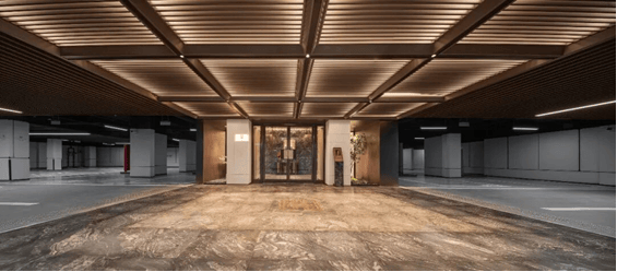 重点打造的酒店式落客区,采用天地墙一体化设计,铺装天然石材,顶部为金属藻井格栅,辅以定制标识系统,塑造出更具仪式感的到达场景。细节处如云石把手、车位柱金属护角、一体式挡车器等,均体现出对美学与功能融合的追求。