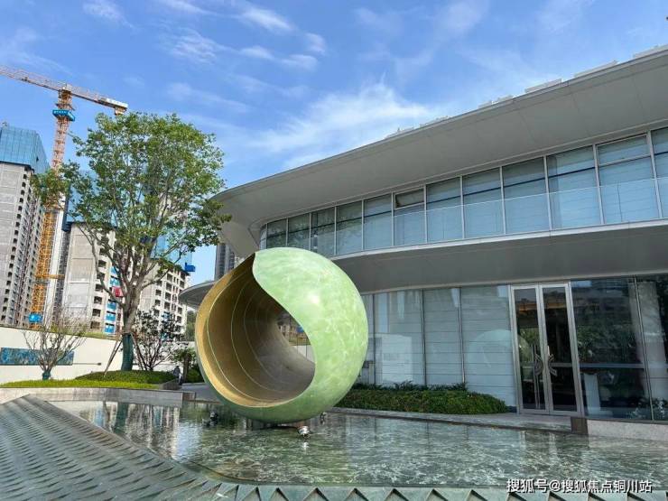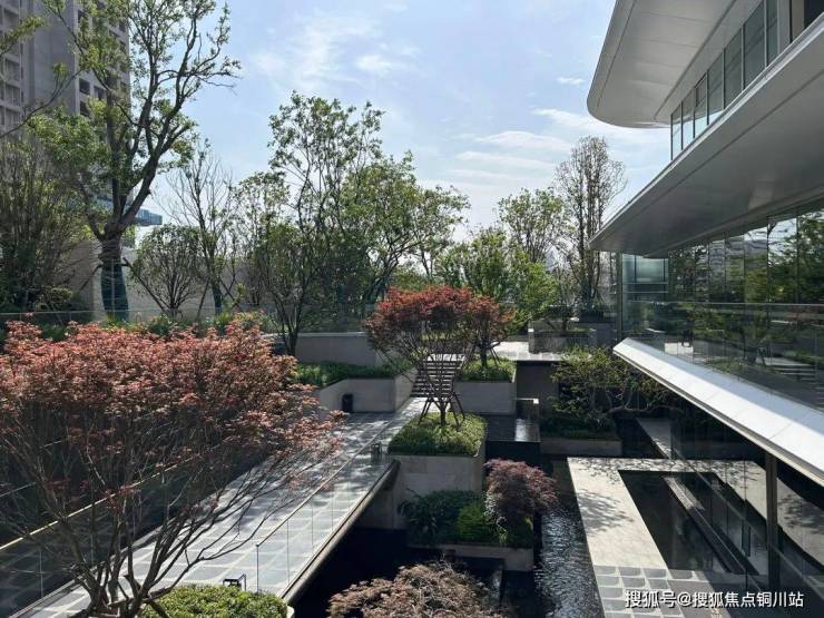 “鎏光谧境”美学示范区,巧妙利用场地高差,规划设置三境叠水庭院空间,临城市界面铺陈拥抱式“华门贵阙“,石材与金属飞檐端庄大气;珠帘水幕与层层叠水相辉映,寓意红星鎏金生意场上的生机活力与财富源泉。