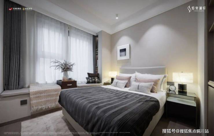 休息区,豪华行政化主卧,具备完整衣帽间、标准卫浴、梳妆系统、全面屏观景飘窗,功能分区堪比五星级酒店。