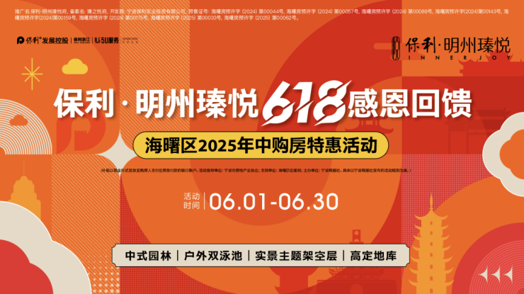 值此盛夏潮涌之际,年中购房窗口期炽热而来,海曙区2025年中购房特惠活动重磅落地,置业礼遇再升级!明州瑧悦同步专属福利:6月1日-6月30日期间,网签房源总价300万以下立享3万元购房补贴,300万以上更狂享5万元购房补贴!(注:补贴以现金形式发放至购房人支付住房首付款的银行账户。活动指导单位:宁波市房地产业协会;支持单位:海曙区住建局;主办单位:宁波晚报社。具体以宁波晚报社发布的活动规则为准。)