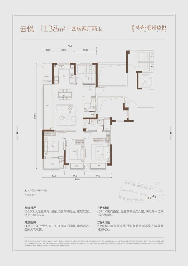 南向约9.4米面宽实现三卧全明采光,主卧套房格局尊崇,配套飘窗、衣帽间(预留)、独立卫浴,营造静谧舒享的私属天地。此外,L型阳台次卧尤其令人惊艳,匠心独运的270°全景阳台,将光与视野极致延展。晨光洒落,凭栏而立,双面诗意风光尽收眼底,成就一处可独享时光、沉浸遐想的浪漫角落。
