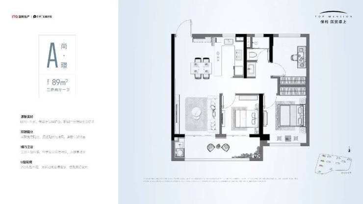 △建面约89㎡的三房一卫户型,功能性强,LDK一体化设计,双阳台,卫浴干湿分离,U型厨房布局,身处小户型,也能有舒适享受。