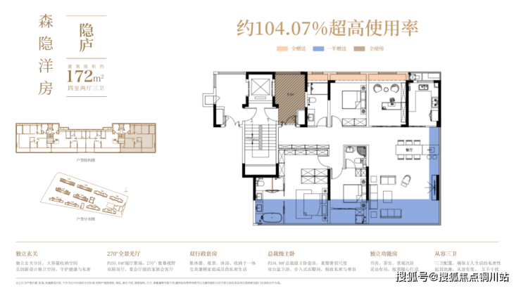 铂森隐庐172平方米洋房户型亮点就更突出了,同样为四个卧室,三个卫生间,其中两个房间为套房设计,业主实用面积约为180平方米。