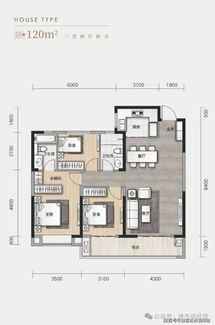 E户型 建筑面积约120㎡ 三室两厅两卫.三开间朝南,大面宽设计,采光面更佳