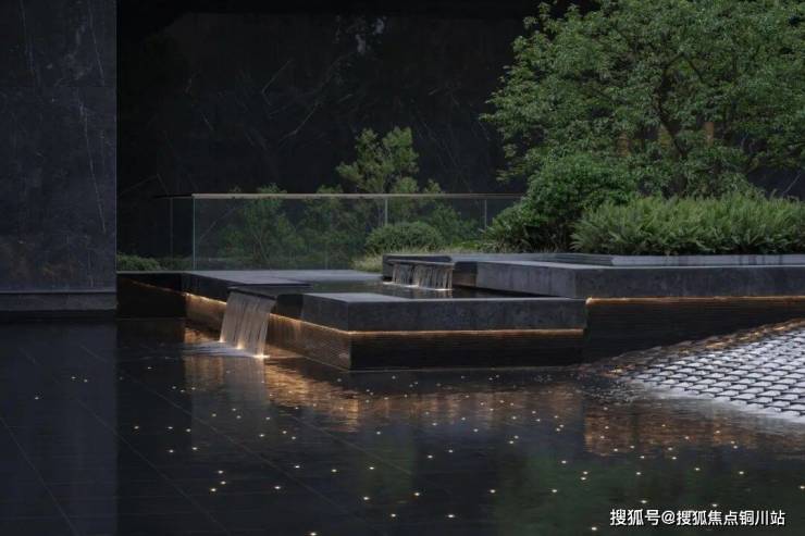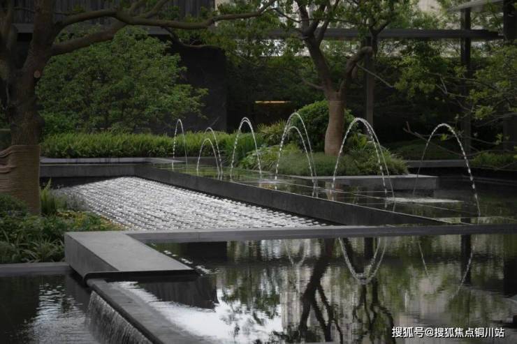 水体包裹菱形面,晶莹斑驳,似水柔和如绢布滑落,双影跳泉在高低层级不同的绿化环境内灵动跳跃,形成合院视线焦点,将绿意与水的灵性在温和中饱含力量。