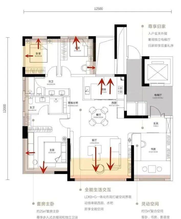 而且该户型还采取类“四叶草”结构,让家庭成员在客餐厅足够互动的同时,又保证了各自休息空间的“私密性”。