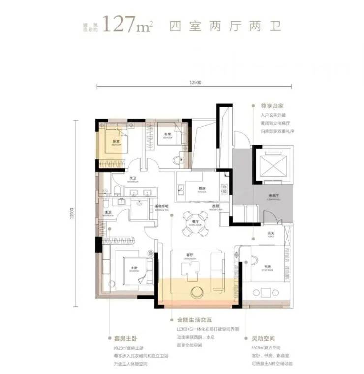 亮点二:建面约127平四房设计+类“四叶草”结构的功能布局,功能性与舒适度更强!