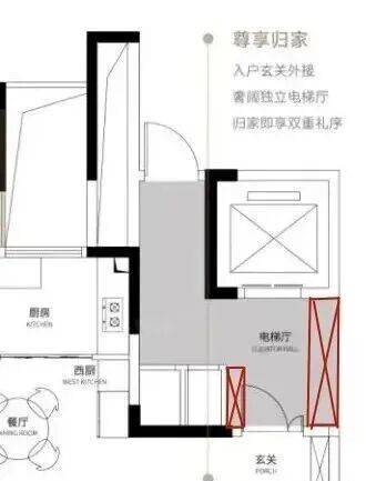 该户型有较大面积的电梯前室,且入户门的两侧还专门预留了足够的柜子空间,可实现鞋柜、储物柜的外置,不仅解放了部分室内空间,还让归家更有仪式感;因为类“一梯一户”的居住体验,未来孩子的推车、骑行车或滑板等,都可以放在电梯厅,既方便又安全。