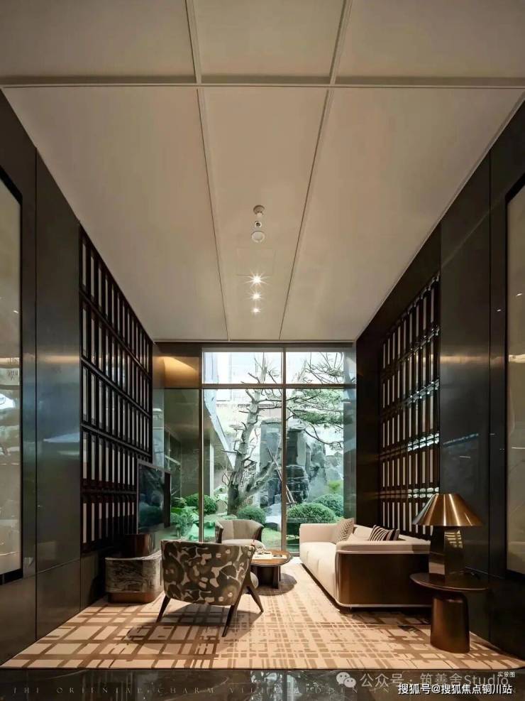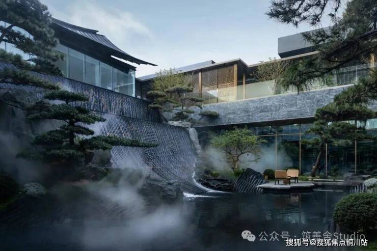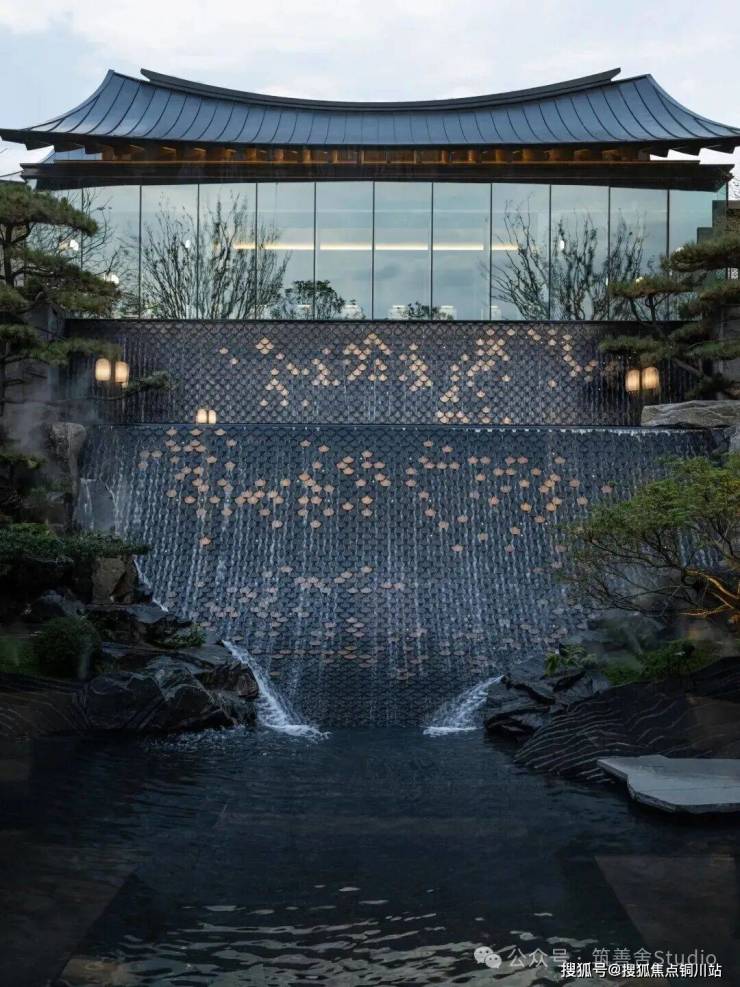 下沉庭院游廊水幕,重塑东方院落意境,九曲游廊与天地院落的匠心设计,漫步其间,光线透过窗棂缓缓流淌,仿佛让时光凝滞。黑松、羽毛枫与拙朴山石错落其间,构筑了一个充满禅意的美学空间。更令人震撼的是进门后那个5米高的水幕——水流自顶倾泻,波光闪烁,在特定光线下化作鎏金龙鳞般的瀑布,既有恢弘气势,又蕴藏悠远意境。动静相宜,堪称点睛神来之笔!