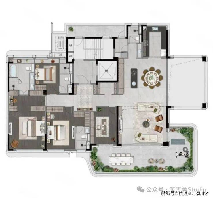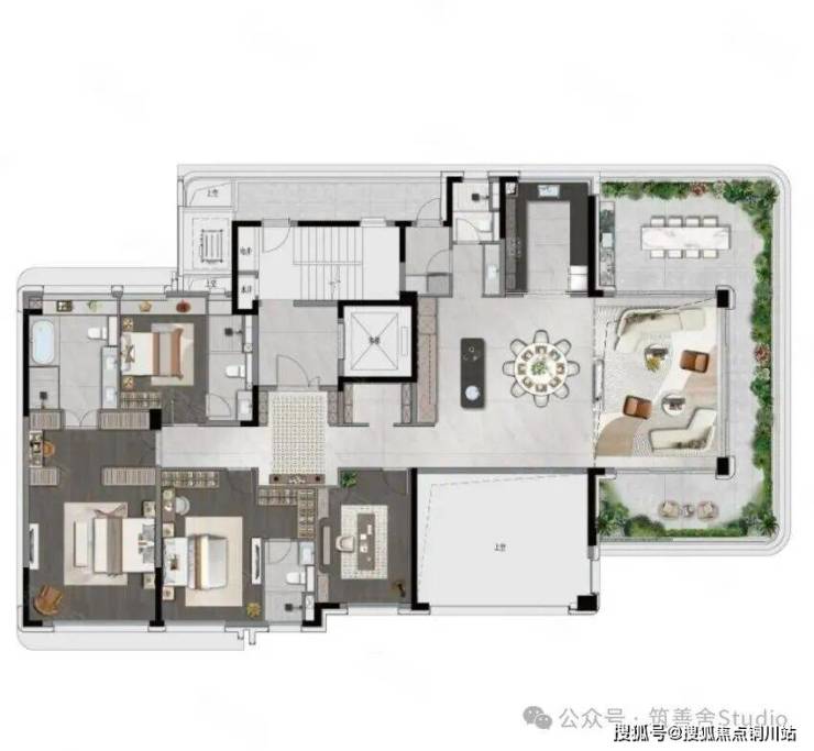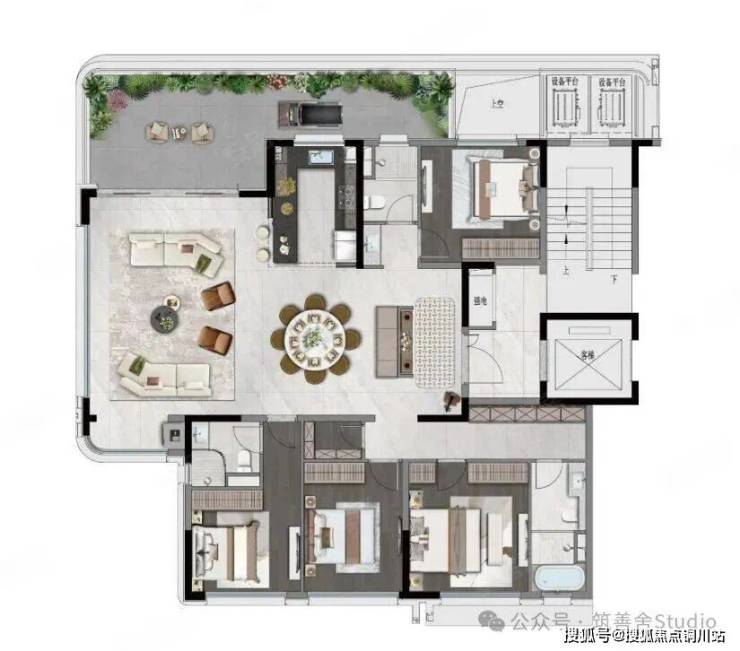 4室2厅3卫1厨, 185平米。独立电梯厅,LDKG一体化设计空间开阔。中西岛台增添雅致,回游动线流畅便捷,客厅270°观景视野无垠。空中花园露台拥抱自然,超尺度主卧套房尽显奢华。