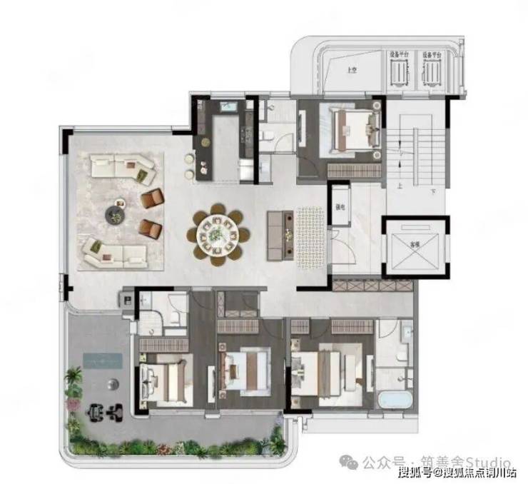 4室2厅4卫1厨, 260平米,平层高厅户型。同样必须是LDKG一体化设计,中西厨岛台布局,回游动线流畅,客厅270度观景视野,客厅双层挑空设计,超10米客餐一体化空间,空中花园露台尽享。除主卧套外,还有双次卧套房配置。