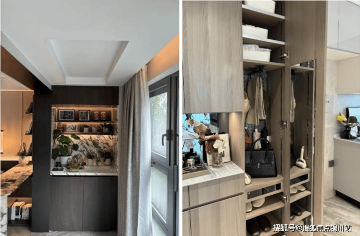收纳设计亮点:玄关收纳融入洞洞板、穿衣镜、鞋柜精灵等设计;橱柜融入米香、碗碟拉篮、下拉篮、烟道洞洞板等设计。
