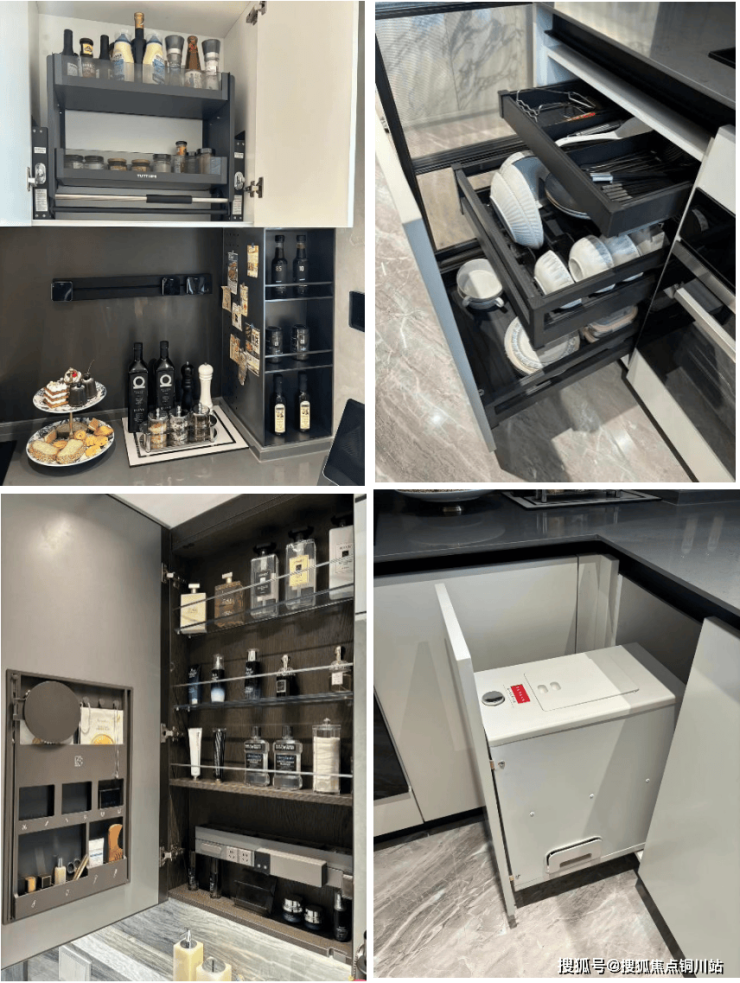 厨房石英石台面项目专属图腾 ,均为客户定制产品,强大的收纳设计,配置下拉篮、碗碟拉篮、烟道包管、米箱。