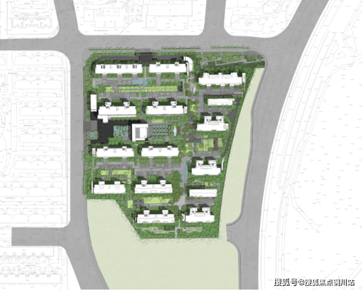 项目2.2容积率规划除4栋高层,剩余9栋均为洋房,是目前板块内唯一拥有洋房新品的住区。立面设计以铝板造型+大面积三玻两腔玻璃,搭配落地窗设计。园区内取意《东园图》卷东园雅集的场景设计,打造“三轴•五园•六进”的归家礼序空间,串联生活场景,写意园林之境。