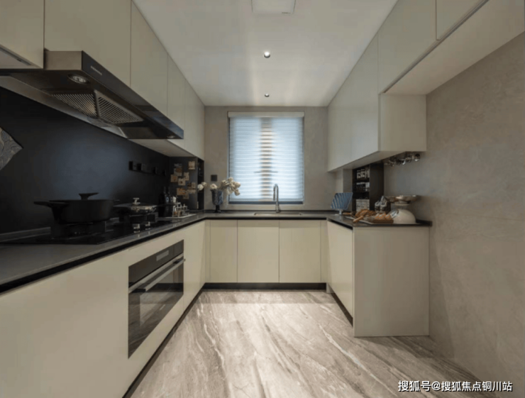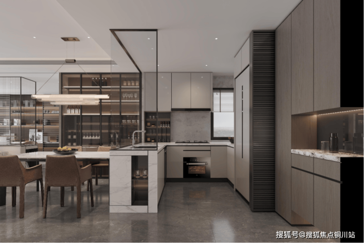 LDKB餐客厨一体化设计,让各个空间融合贯通,增加了家庭的互动性,不设限的空间格局 。客餐厅回风口装饰 、厨房石英石台面项目专属图腾,均为客户定制产品。