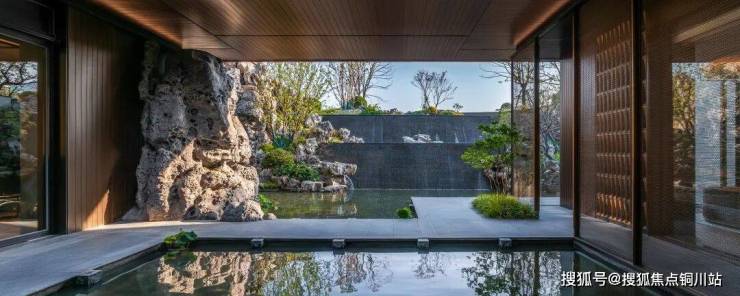 叠石理水间的设计巧思,来源于寄畅“介如峰”美人石、天下第二泉。曲折的石板桥、流水、枫叶、月洞等,在此刻,都成为致敬寄畅园的经典场景,达到“小院深藏有洞天”的境界。