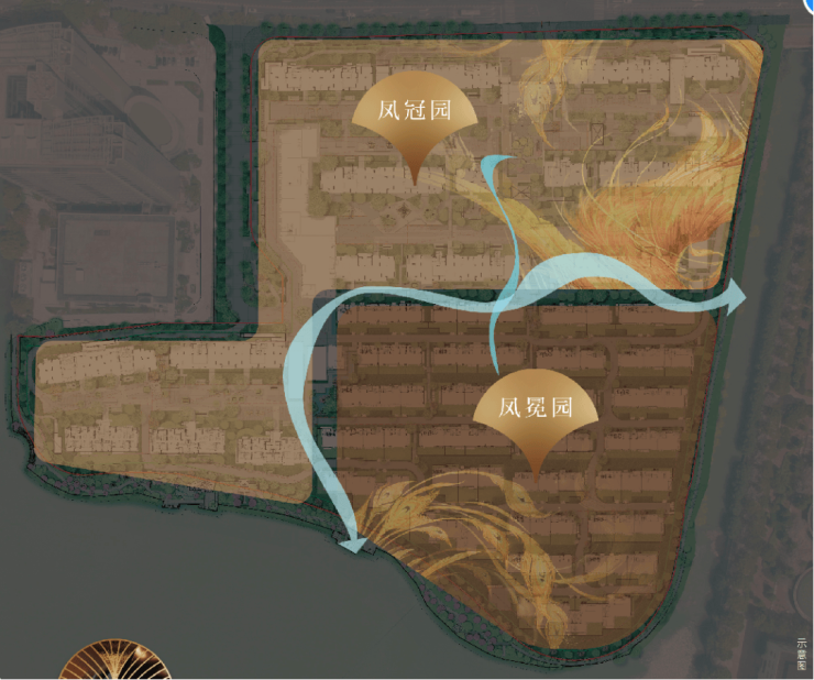 1,宏观上,地块本身三面环水岛居的特质,引金鸡湖水入园,寻根水陆并行的古城格局