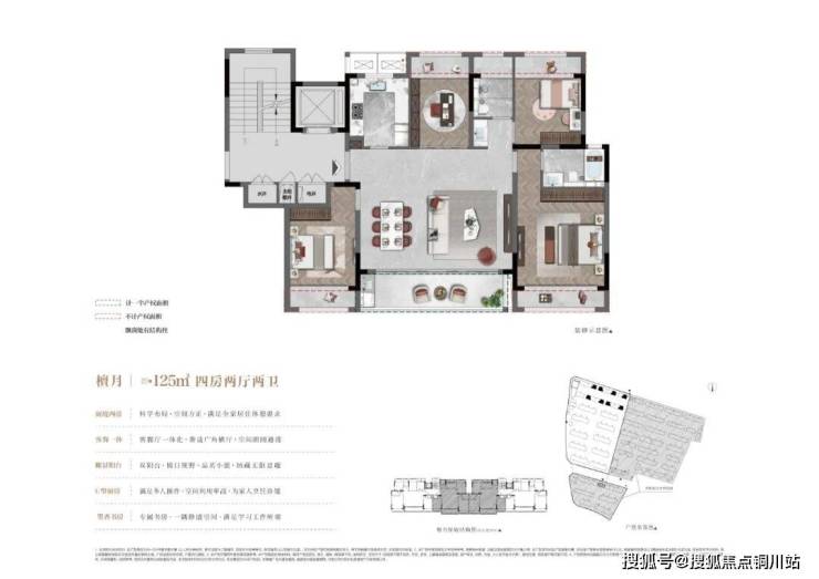 ②建面约125㎡洋房,4房2厅2卫:大横厅设计,外接双联阳台;四开间朝南,客厅北侧设置书房;