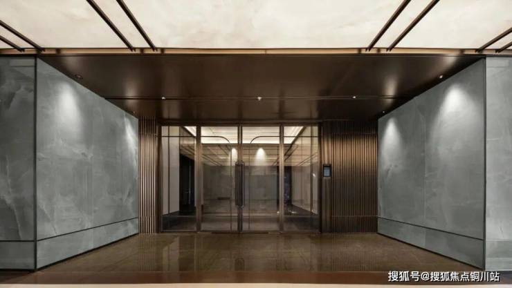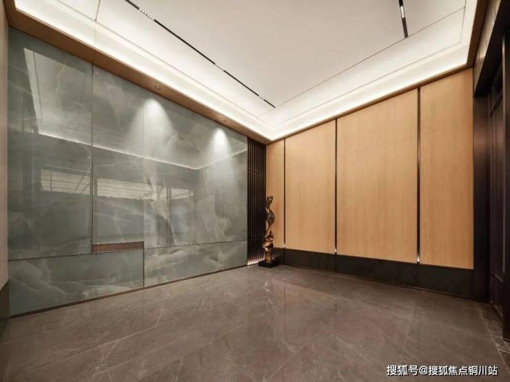 车库入户大堂,也是超乎预期,做出了苏州罕见的地库玄关,天青色岩板背景墙、无主灯吊顶工艺、智能可视对讲……满屏高级生活格调。