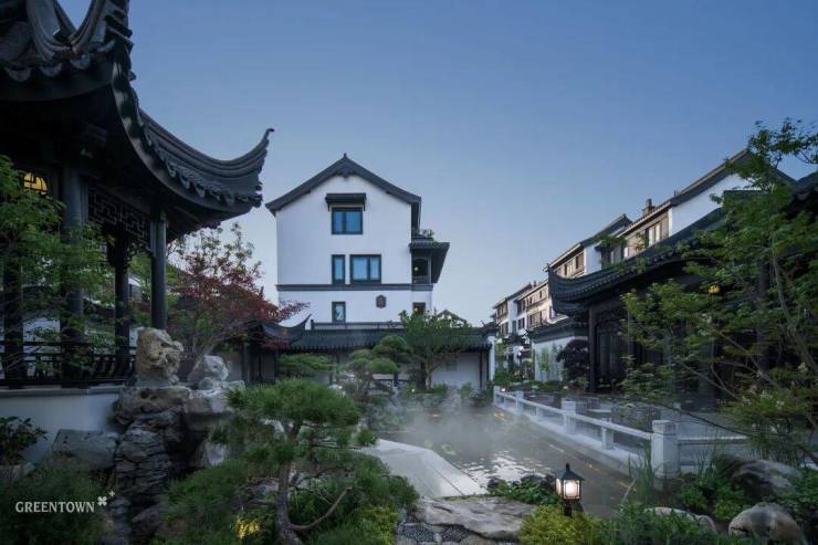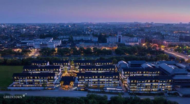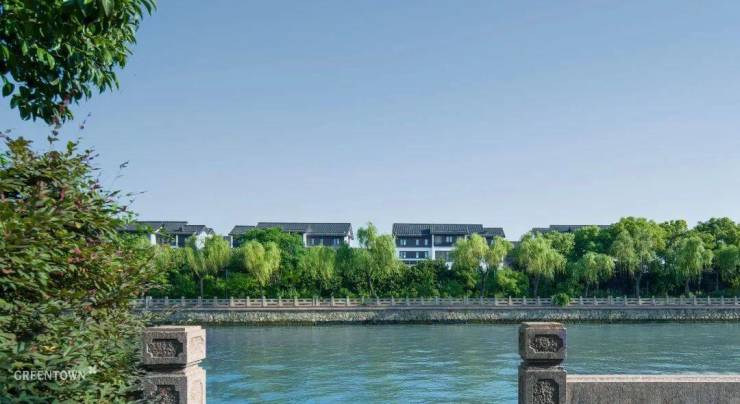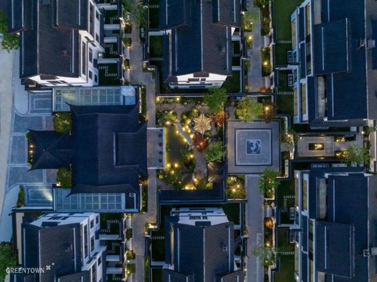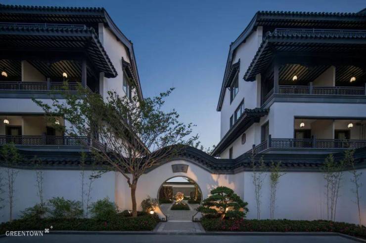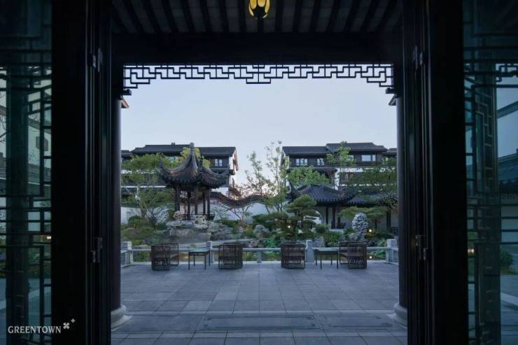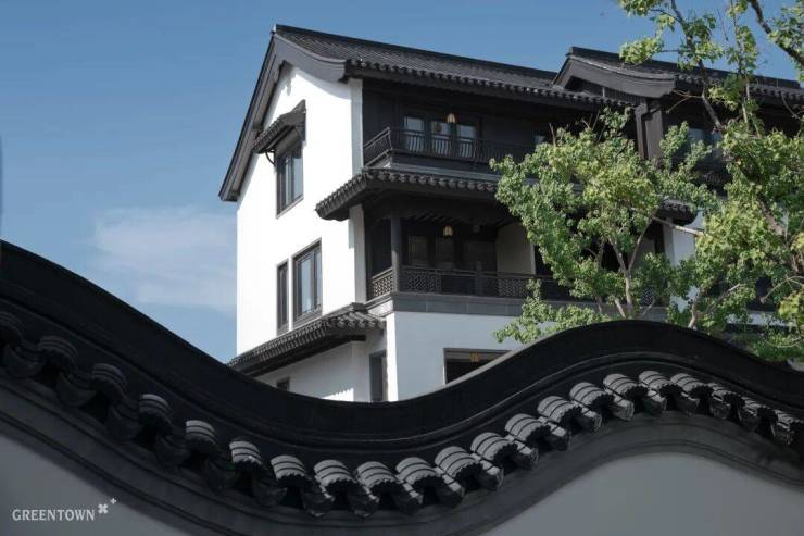 随处可见翩翩雅致的飞檐,赋予建筑以庄重威仪;灰瓦坡顶与小青瓦、通透玻璃、咖色饰板交相辉映,呼应运河岸流传千年的古建名宅,也展现着东方中式的三重神韵。