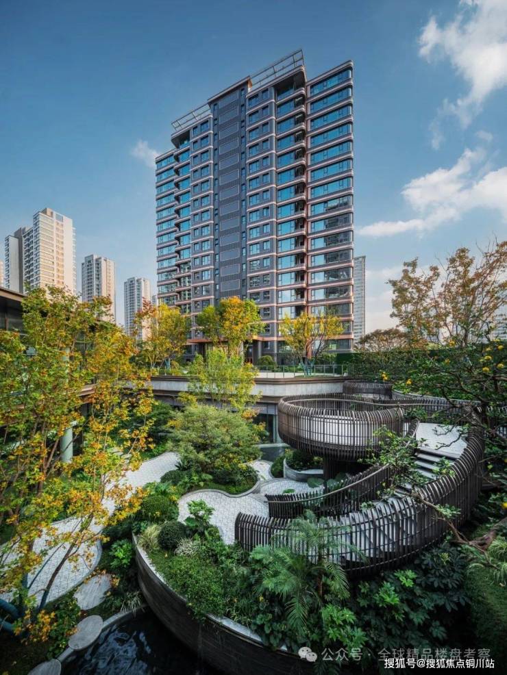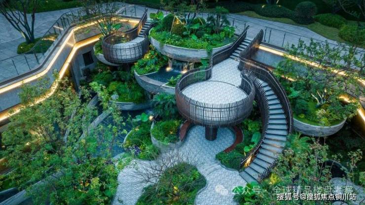 做出6米高差,8层平台,通过高低错落的设计,形成视觉上的层次感。顺着旋转步梯向下,在庭院中自由探索,随意停在一处都可以观景。近处潺潺的水声,和远处涛涛的江声遥相呼应,营造出园林秘境中听潮的特殊体验。