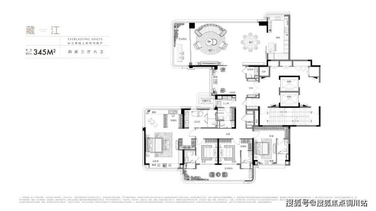 建筑面积约385㎡四房三厅六卫,双开门入户,独立门厅,两侧是男女主人各自的鞋柜,满满的一排,能装下无数自己的最爱。整个户型北向是大尺度的会客区,长约10.9m的客厅开间,面积达到约86㎡宽奢场域,呈现一处“空中长江会客厅”。