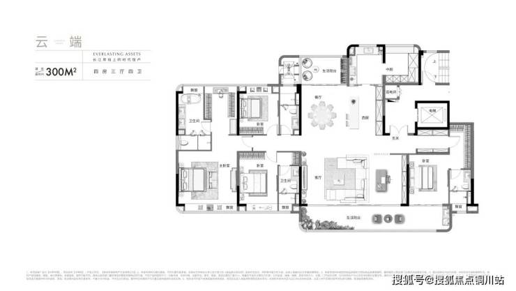 300㎡户型四室三厅四卫户型,装甲对开门+独立玄关,即是一座入户花园,开阖之间的礼制层层递进。约24.5m南向面宽,约9m宽的横厅连接约12.6m宽景观阳台,约3.45m层高。