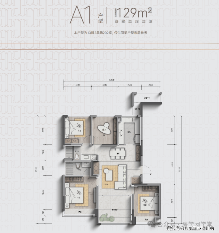 建面约129㎡户型:四房两厅两卫