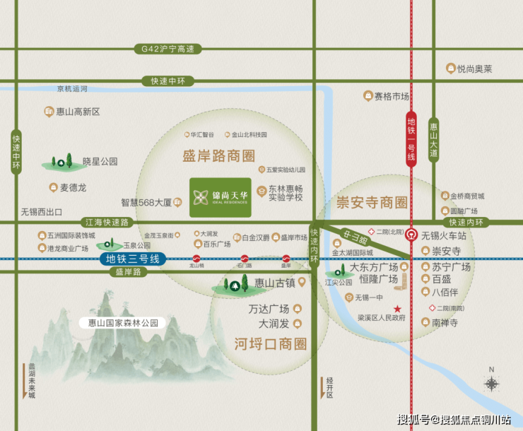 锦尚天华鼎立中山路西,出则繁华,入则静谧,拥享梁溪主城全维丰盛配套,江海西路、惠山隧道、快速内环、中环线(在建中)构筑快速交通路网,畅享一刻中心的高效便捷;中山路、盛岸路、河埒口等核芯商圈环伺,惠山国家森林公园、惠山古镇等丰富文旅资源,繁华都会与自然生态达成平衡,城市新贵的居住梦想在此得以实现,热销自然水到渠成。