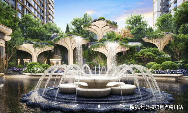 约100米景观主轴步移景异,5棵"东方树"错落高耸,30米纵深立体叠瀑流水潺潺。四栋建筑以阔绰的尺度围合于花园之中,在四季流转里,实现"人—建筑—自然"三者共生的理想人居,雕刻隽永诗意,带给业主度假酒店般的惬意和轻松。