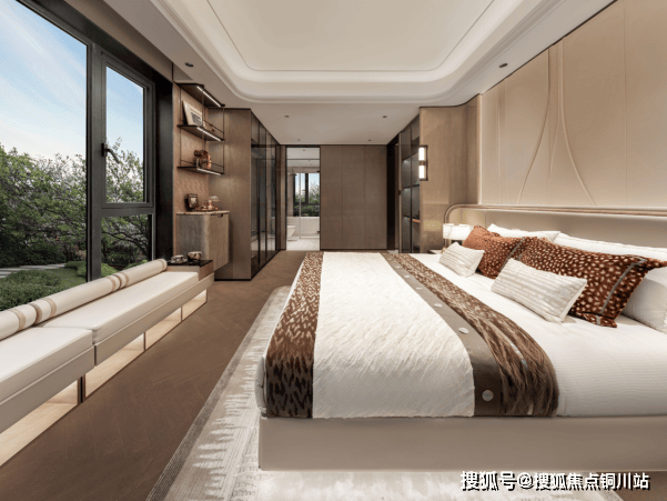 双主卧套房设计,完美解决了多代同堂的隐私与舒适痛点。其中,主卧套房约30平方米,4.05米超大南向开窗面,加上270°转角落地窗,带给业主阔绰的尺度和绝佳的景观视野。