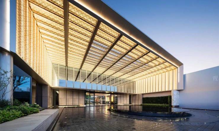高境府门,高约8米的门头,用铝板、石材、玻璃幕墙等材质。灵感源自上海宝格丽酒店的环岛式落客区、三亚艾迪逊酒店的社区大门、香港瑰丽的社区大堂等设计理念。