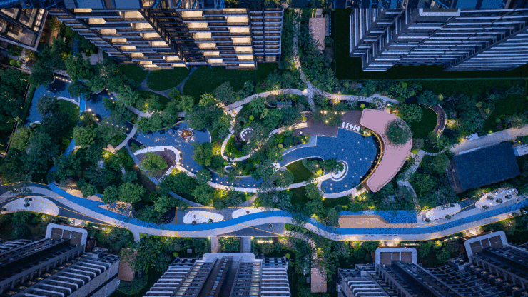在这里,建筑不再是孤立的存在,而是如同花园里自然生长出来的,它们与蓊郁的绿植、蜿蜒的小径、灵动的水景相互交织,形成了这幅和谐共生的美丽画卷。