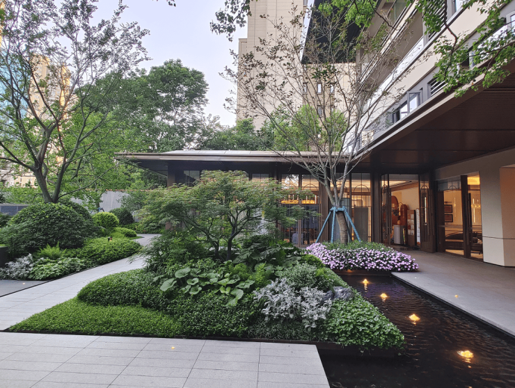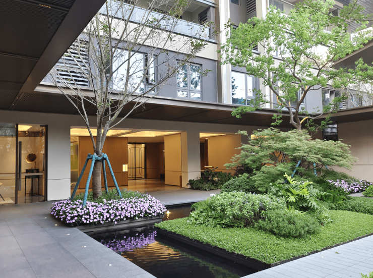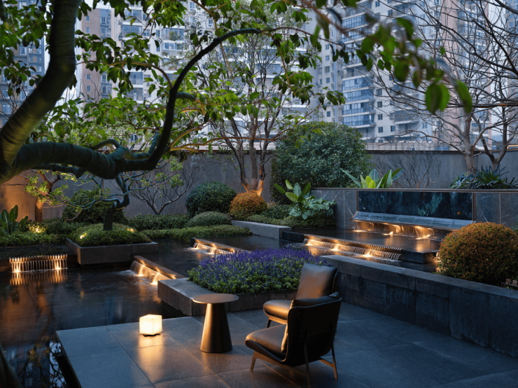 该项目虽然体量不大,但小区内部空间却别有洞天。穿过门庭,成熟且精致的园林、灵动的水景随之展开。
