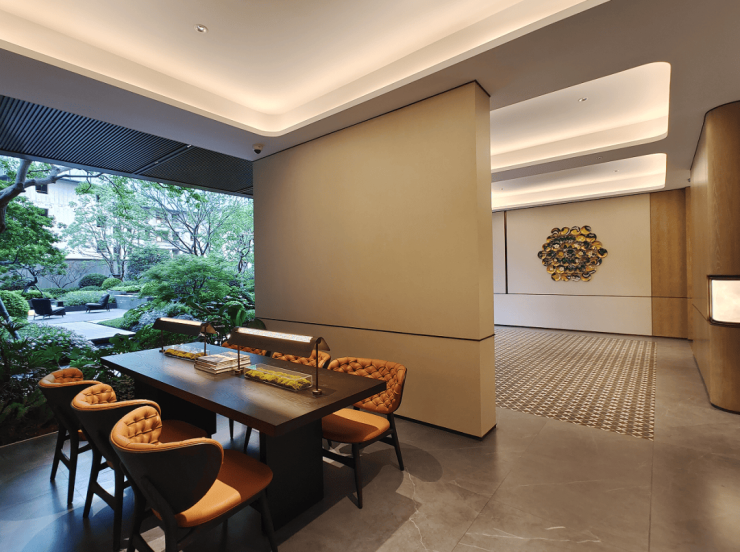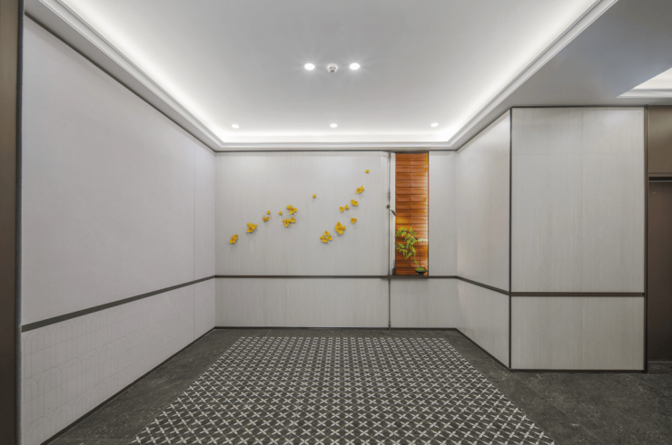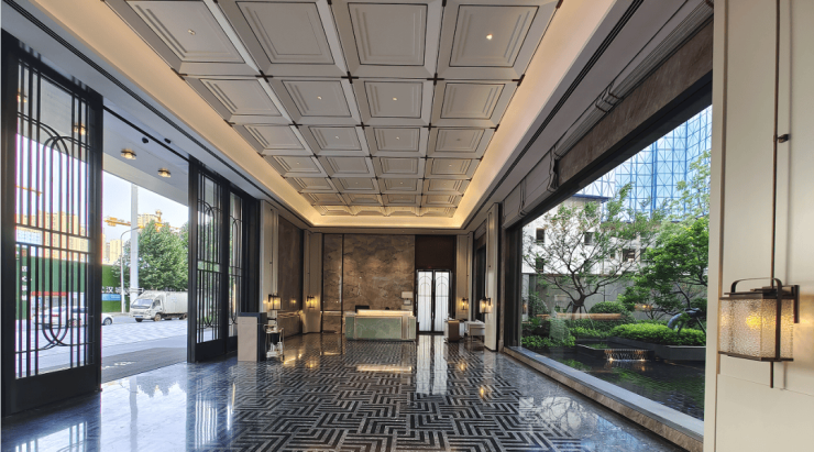 项目打造了地上地下双精装入户大堂,地面及墙面均采用成本更高但质感更好的岩板,配以酒店式感应自动玻璃移门,尽显高端装潢。