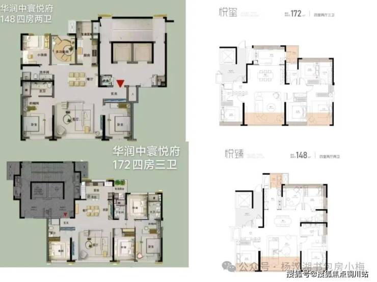 每个面积都有边户,主体偏改善,但最小就是148平的户型,但中寰悦府148平做了4房户型还是比较实用的。门槛在区域内不算低。首开的1、2号楼,全部为148平;5号楼全部为172平户型。1、2号楼是西南朝向,采光会有一定影响,3/4/5号楼东南朝向相对来说会好一些。