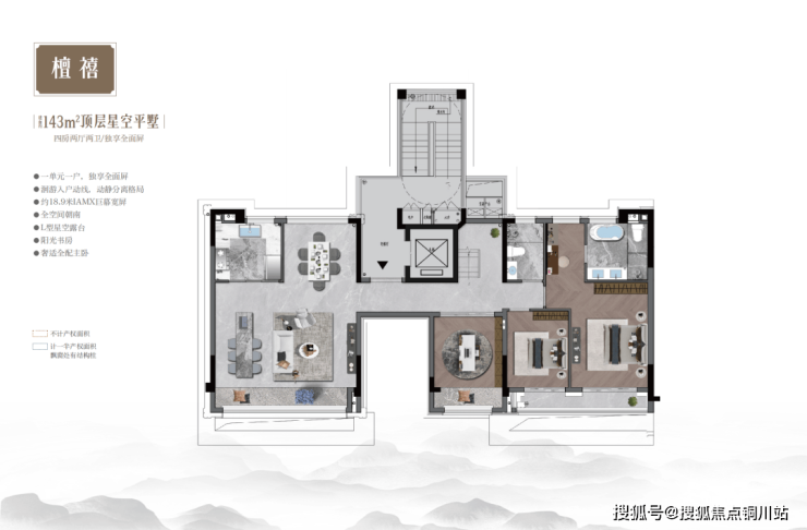 顶层最大赠送约85㎡+露台,自由发挥想象,可以用天然石材或桧木打造日式私汤汤屋,也可设计镜面泳池,亦或预留空间,做鸡尾酒会等定制主题晚宴,搭配投影幕布播放艺术电影……