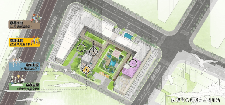 景观设计以“全龄友好、功能复合”为原则,构建“一轴六区”的空间结构。“一轴”即中央景观轴线,串联六大功能区:烟火商业空间、门庭礼序空间、汀泠水苑空间、流光艺廊空间、谧林寻境空间、宅间悠享空间。