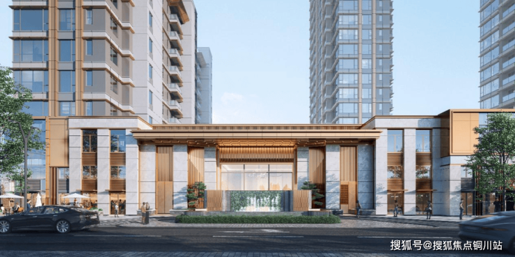 在极简的基调上,我们以金属的细节雕琢韵律。独具匠心地运用玫瑰金色铝板,通过精心设计的横向斜切线条,强化建筑横向的舒展感与流畅度,同时贯穿整体的竖向铝板线条,与之构成精妙的对比,极大地丰富了立面的层次与细节。这一横一纵的交织,宛如一曲精心谱写的建筑交响乐,于简约中见丰富,于冷静中透奢华。