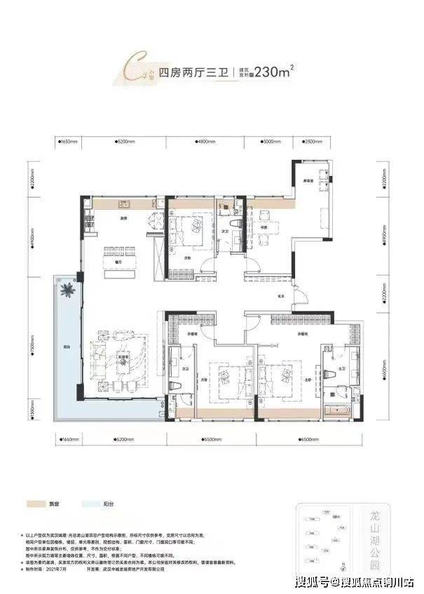 建面约270㎡四房两厅三卫的户型,三面采光,南向面宽居然超20米,可以极致地拥拦阳光和湖景。