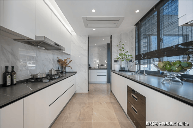 想象一下,保姆在中式厨房烹饪,女主人在岛台上摆一排食材、水果、饮料,以及红酒,来招待来宾朋友。