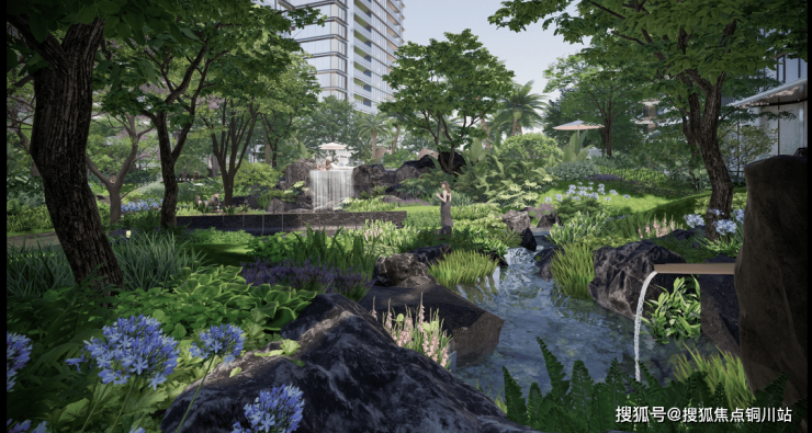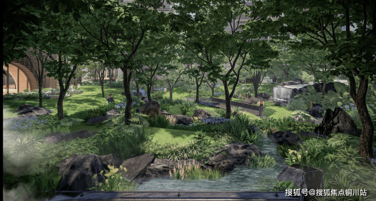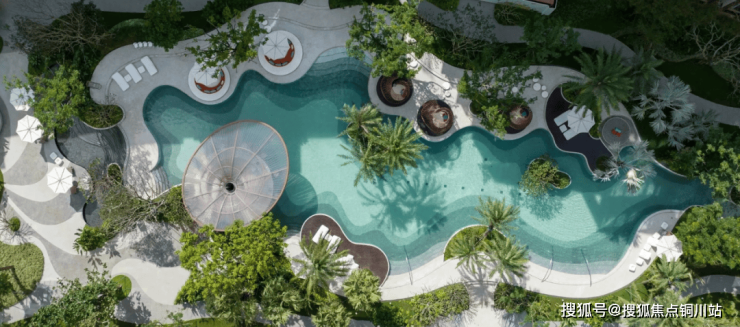 关键是内部,还打造了丰富的水系,有泳池,水景,甚至还有溪流!