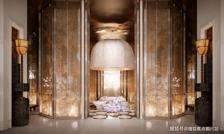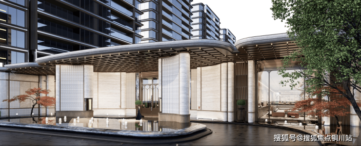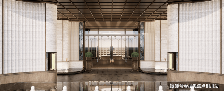 我们看到安玥的主入口,灵感来源于迈阿密1428塔楼公寓,将石面切割做出了丝绸感,建筑立面温润艺术,这就是十足的仪式感。