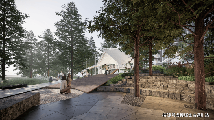 偌大的中庭里,会做出林荫、大树、溪流、原生砾石与蕨类植物的场景,有点像日本知名电影《小森林》的场景。