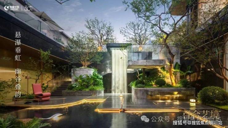 悬挑的飞瀑串联着地面和下沉空间,另外还搭配了阶梯式绿化、镜面树池错层平台,空间感很强。