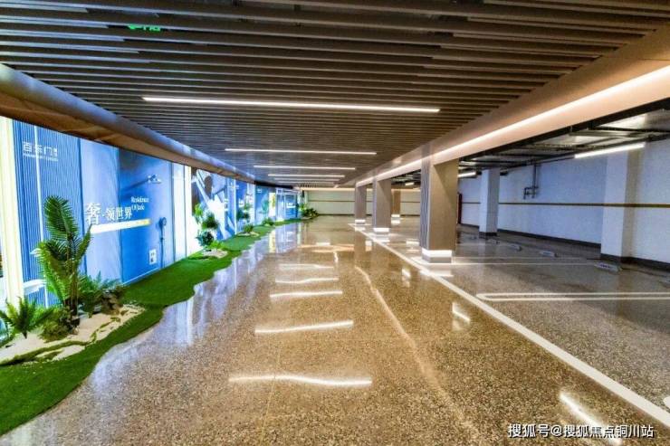 再将目光聚焦到一般项目容易忽视的地库空间。明亮阔绰的地库空间内,顶部以咖色格栅及吊顶光源重塑空间层次感,与之相对应的是在灯光下熠熠生辉的彩石地坪。